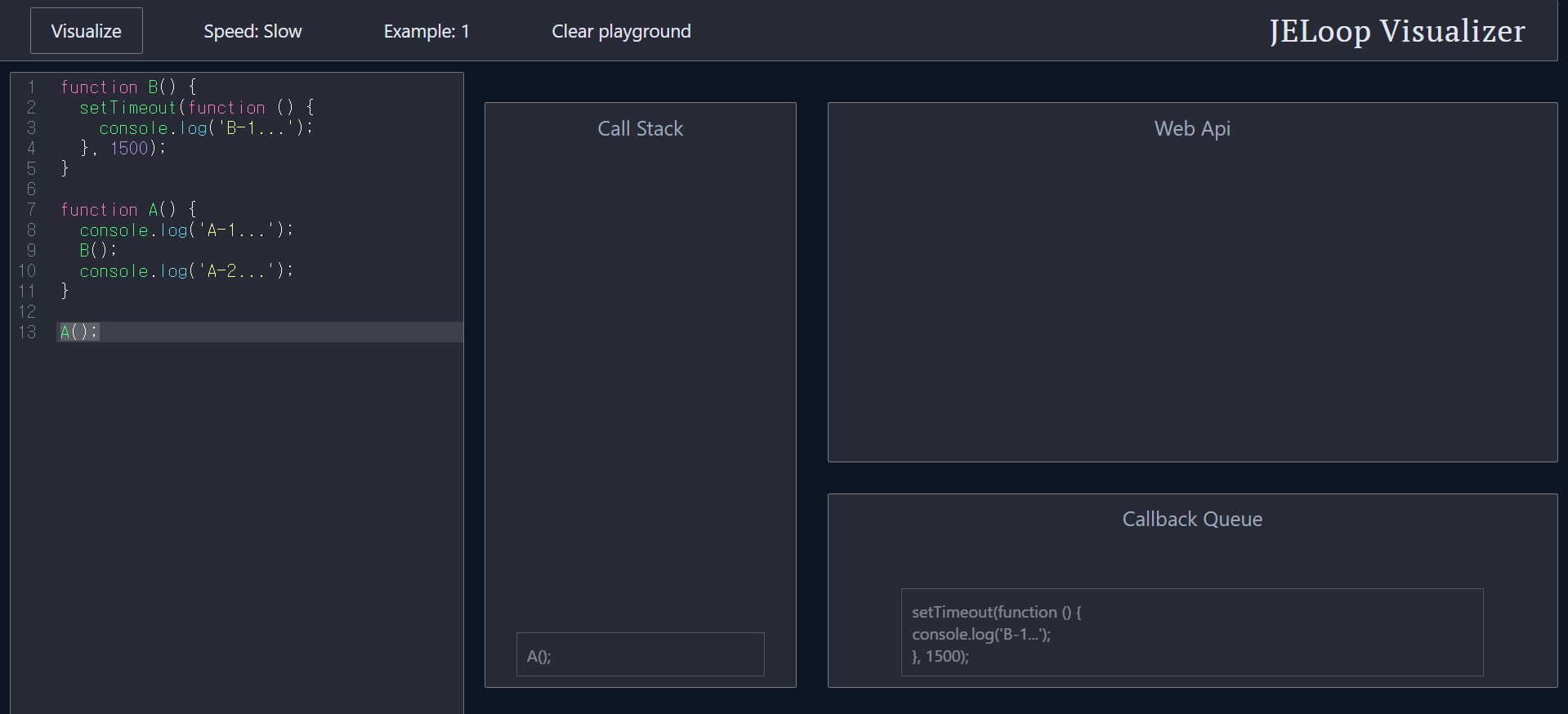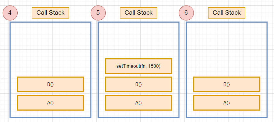 5: B()함수 내 setTimeout(fn, 1500)호출로 쌓이게됨
