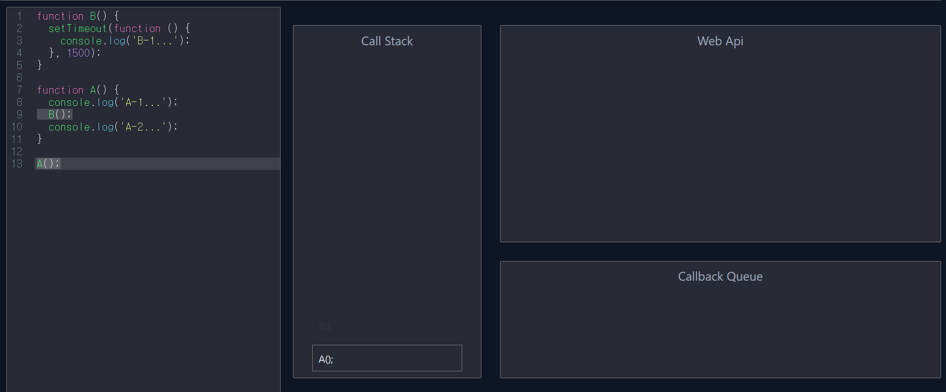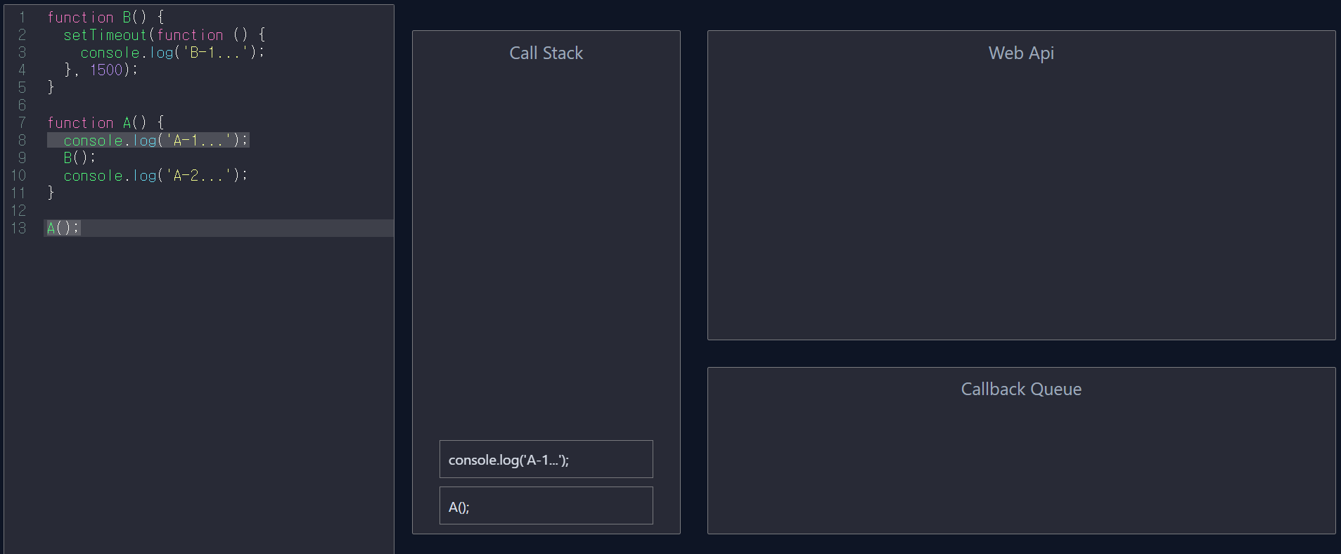 8: 1500ms 흐르는동안 console.log('A-2...')구문 도착으로 쌓이게됨