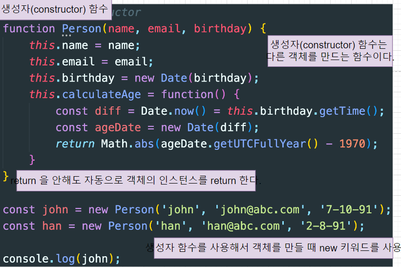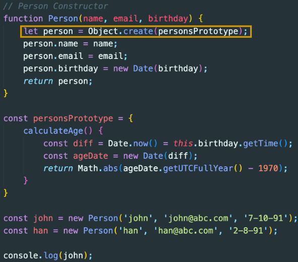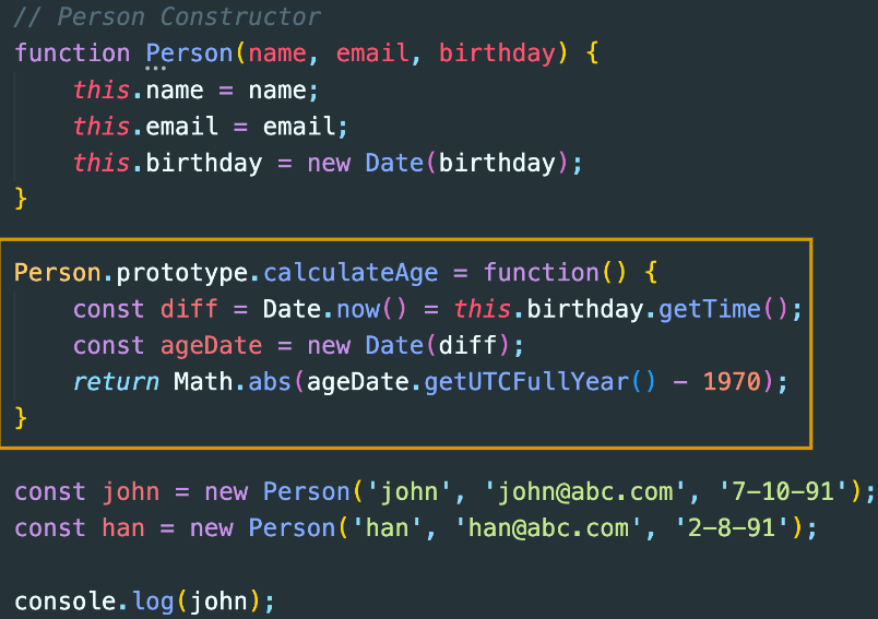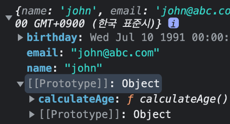 john과 han은 name, email, birthday은 값이 달라 재사용이 어렵지만 공통적으로 들어가는 calculateAge 경우 재사용 가능으로 Prototype의 객체로 넘겨주는 것이 좋다