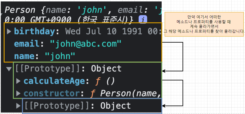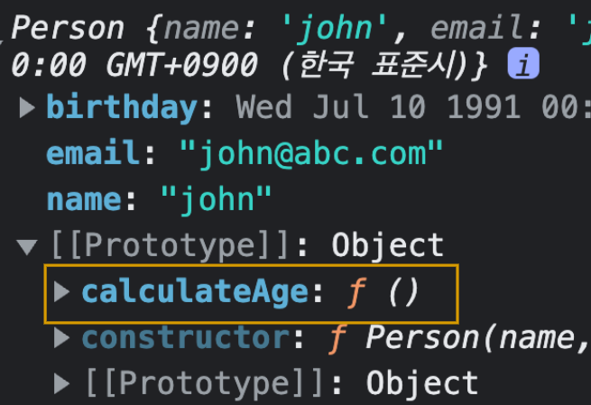 그래서 명시한 메소드 먼저 찾게 되고, 프로토타입 객체로부터 사용한 함수를 탐색하여 calculateAge함수를 찾아 사용한다