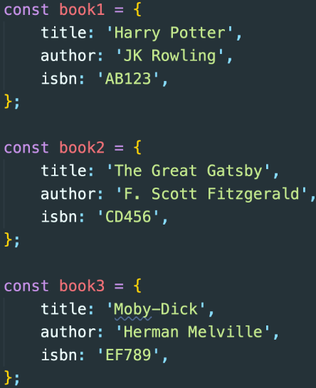 => 코드가 반복되고, 수정사항 생기면 모든 book 객체에 다 수정해야 하는 단점