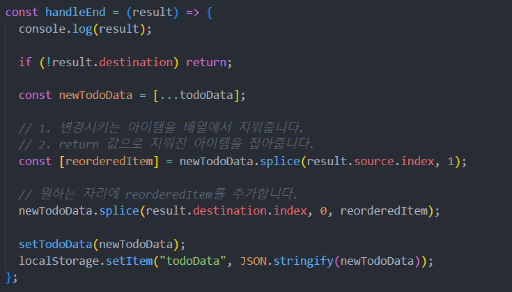변경시키는 아이템을 배열에서 splice 함수로 삭제 한 값을 리턴으로 reorderedItem에 할당