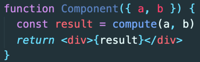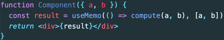 compute 함수에 넘겨주는 a, b의 값이 이전과 동일하다면 컴포넌트가 리 렌더링 되더라도 연산 다시 하지 않고, 이전 렌더링 때 저장해두었던 값을 재활용