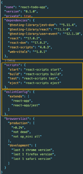 : 앱 실행, 빌드, 테스트 등의 스크립트가 명시