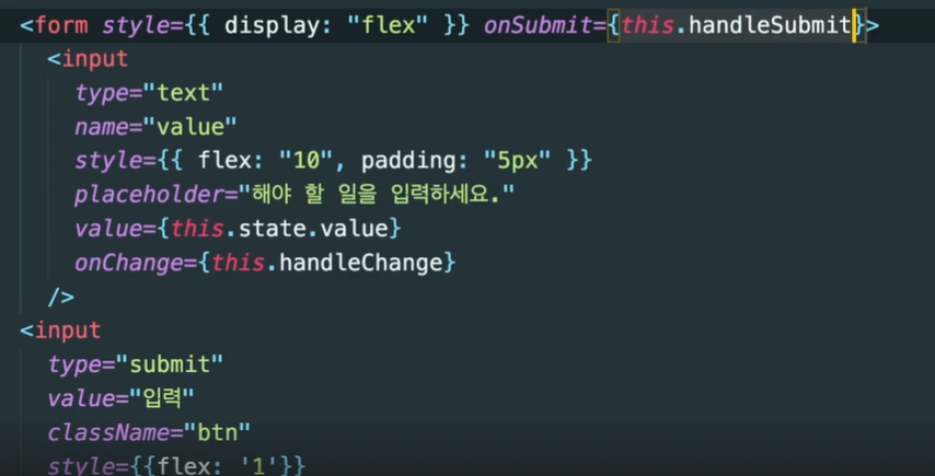 input text와 submit을 감싸는 form 태그에서 onSubmit(제출 이벤트)속성으로 handleSubmit 함수 호출