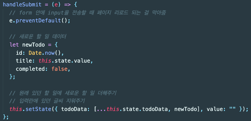 전개 연산자(...)로 기존 데이터들과 newTodo를 합쳐서 todoData에 할당