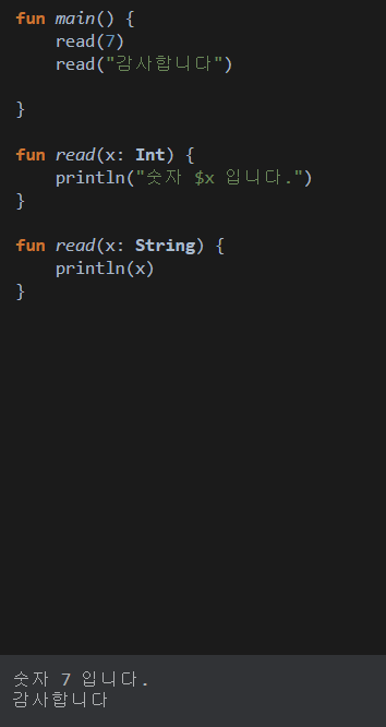 이렇게 같은 이름의 함수이지만 파라미터의 자료형이나 개수가 다르다면 서로 다른 함수로 동작할 수 있다.