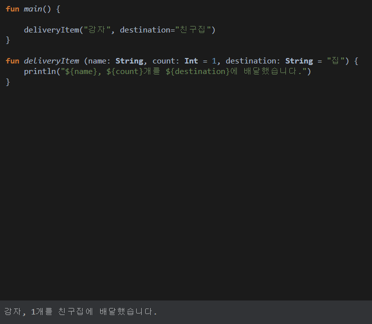 원래 파라미터를 3개 받아야 하지만 함수 호출시 파라미터를 name만 설정 했더라도 함수 자체에서 count와 destination의 경우 디폴트 값을 주었기에 정상적으로 작동한다.