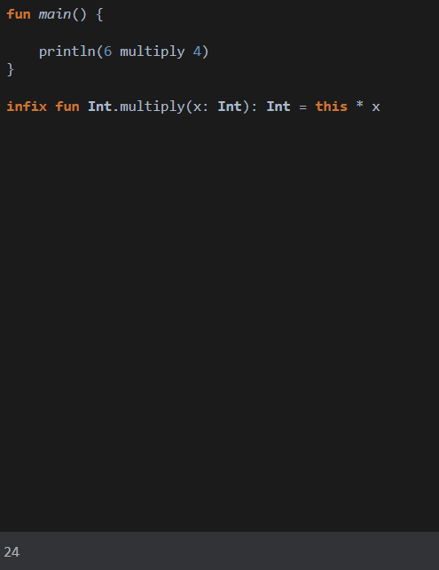 그렇게되면 6 multiply 4에서 6은 infix가 적용되는 객체이고, 4는 파라미터로 받은 객체이다.