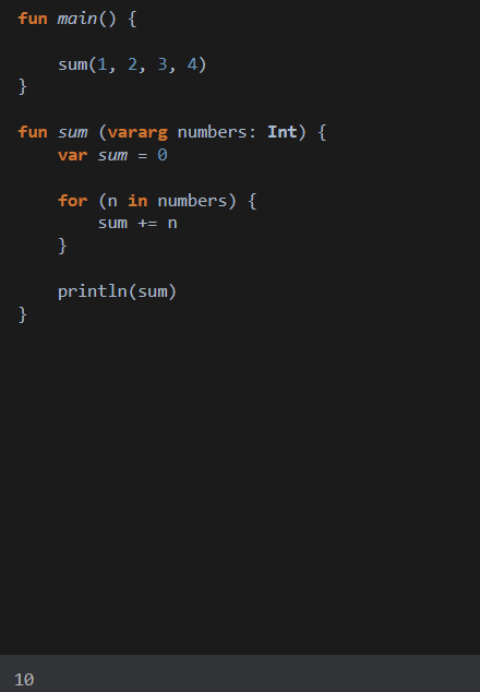 같은 Int형 자료형을 파라미터로 4개를 넣었지만 vararg로 하나의 파라미터로 통일하여 받게 되어 합계에 대한 기능이 동작하는 것을 알 수 있다.