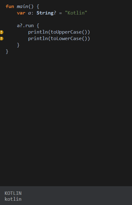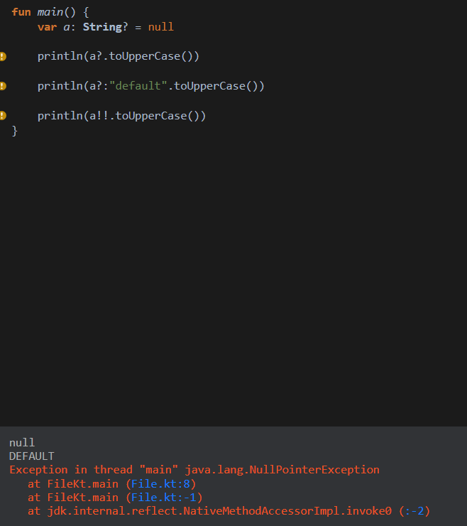 보는 바와 같이 null safe operator 경우 null이라면 toUpperCase 실행하지 않아 a의 값 null그대로 반환한다.