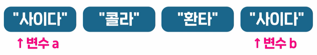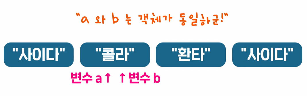 : 서로 다른 변수가 메모리 상에 같은 객체를 가리키고 있을때만 동일하다고 판단