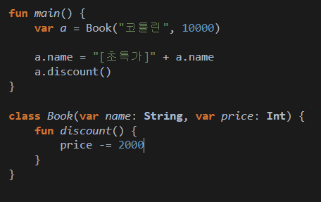 원래 책 이름과 가격을 속성으로 정의 내린 클래스를 이용하여 인스턴스 객체를 생성 후 책 이름 수정 및 가격 할인을 할 때 이미지와 같이 했다면