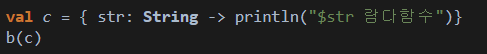 val c: (String) -> Unit = { println("$it 람다함수") }