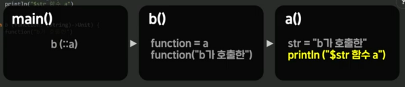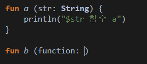 파라미터로 넣을 때 자료형으로 function (String) -> Unit으로 넣어주면 b 함수는 a의 파라미터로 들어가게된다.