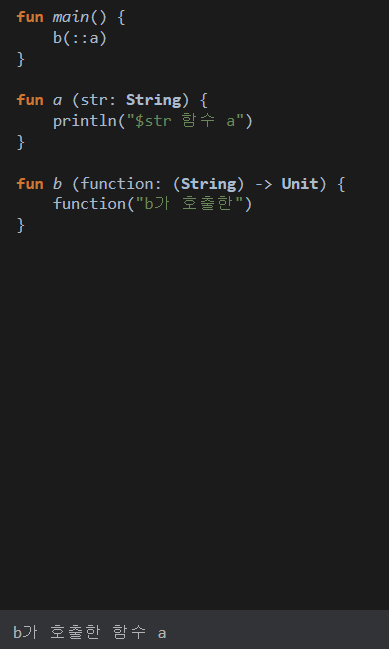 main에서는 호출할 때 b(::a)로 표기를 하는데, 이는 b 함수는 받아온 a 함수에 "b가 호출한" 이라는 값을 넘겨서 호출한다. 고차함수로 파라미터로 넘긴 함수를 호출할 때는 반드시 "::" 키워드를 명시해줘야 한다.