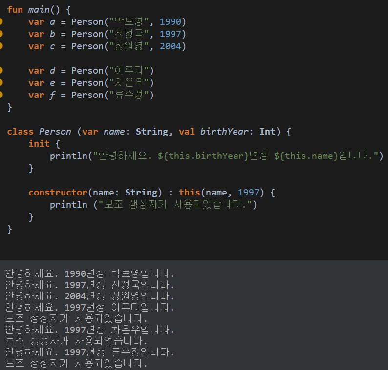 이미지와 같이 이름으로만 구성된 Person객체에 대하여 접근할 때에는 보조 생성자를 통하여 name에 대해서만 파라미터로 받고, this를 통해 기본 생성자의 birthYear 속성을 1997로 고정 초기화하여 생성한 것을 알 수 있다.