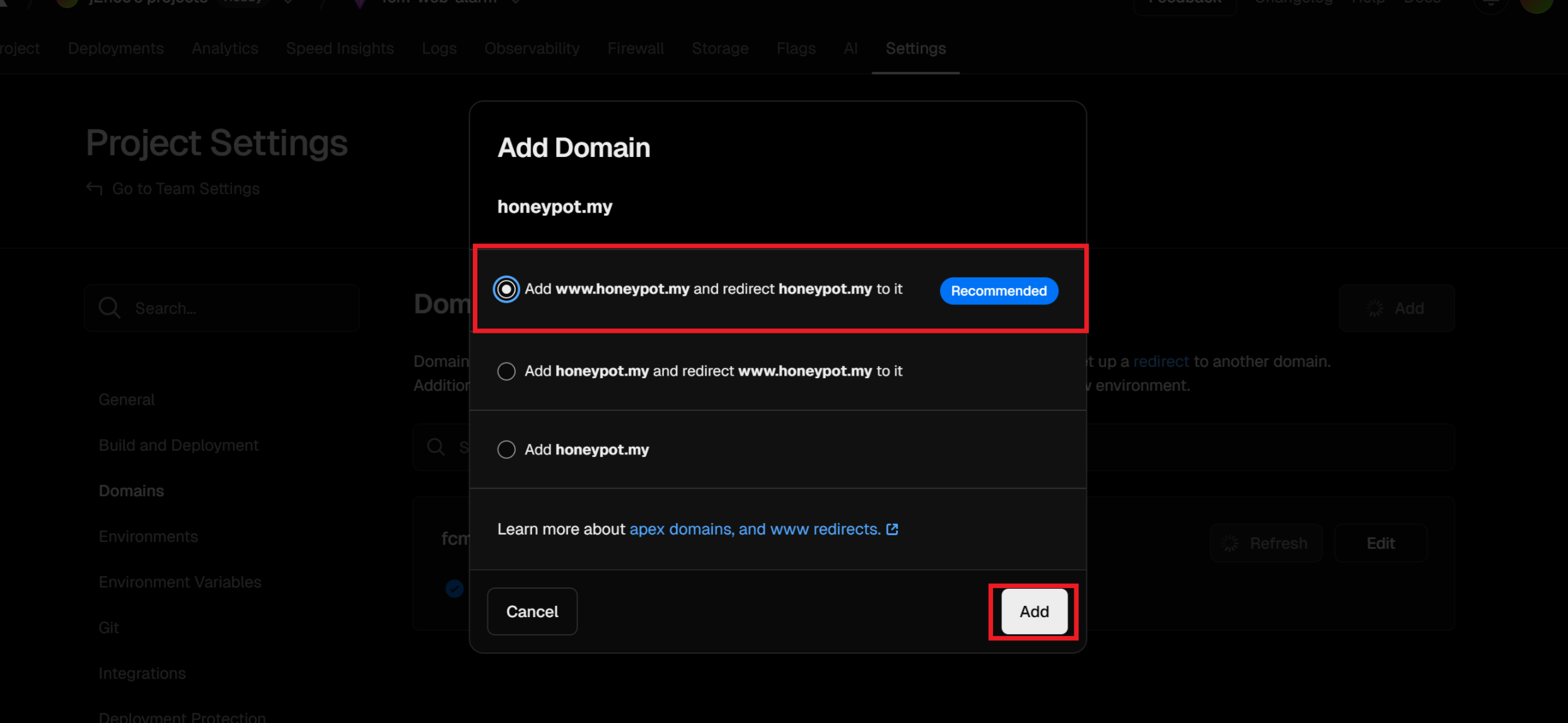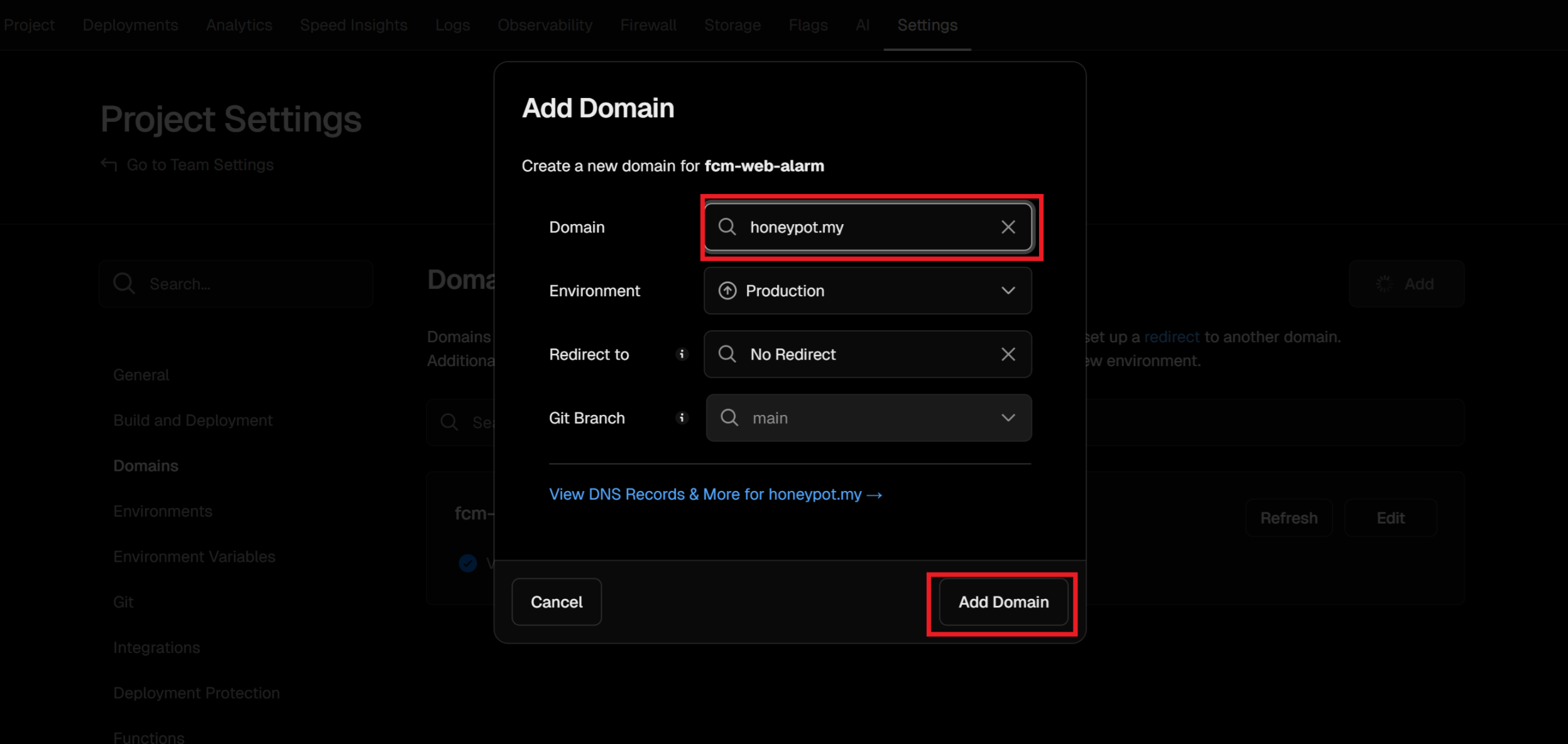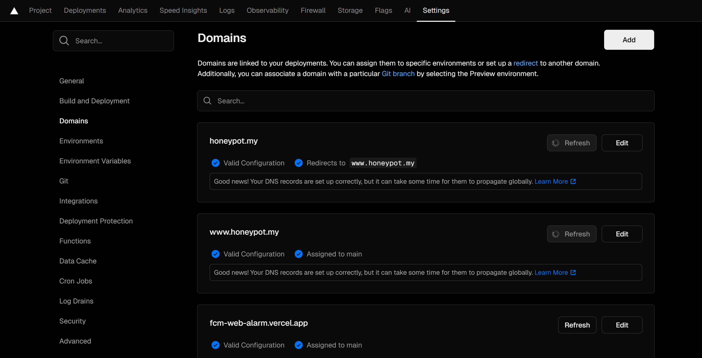 Vercel에 배포한 프로젝트로 들어와 Settings - Domains를 누른다.
