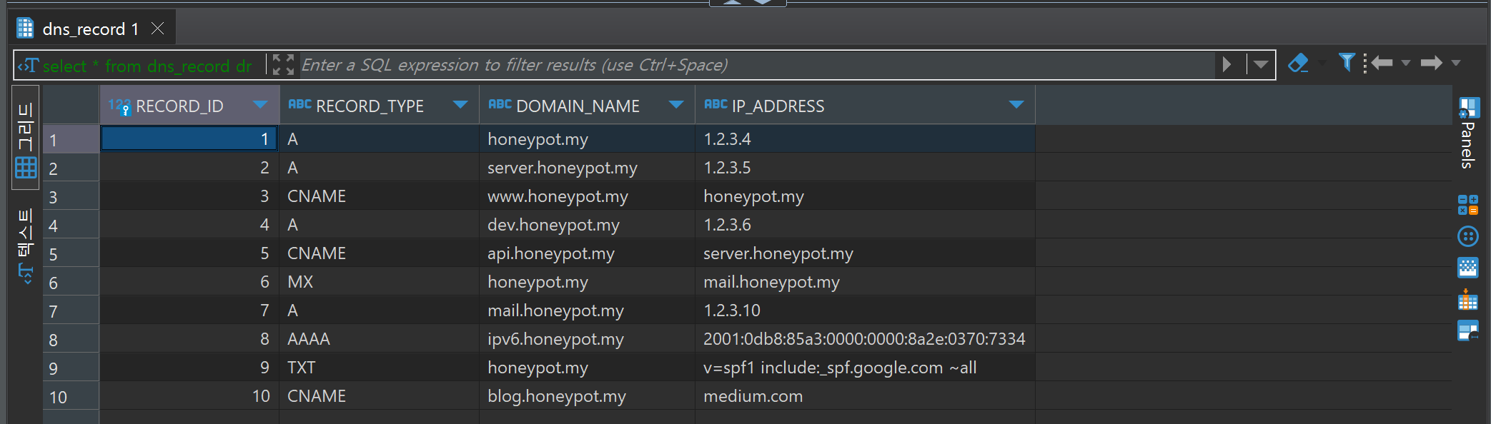 honeypot.my와 server.honeypot.my 도메인을 내가 원하는 ip주소로 매핑시키기 위해서는 DNS 서버의 DB에 접속하여 도메인 매핑 정보를 가져와야 한다. 그리고 해당 정보를 DNS 레코드라고 한다.