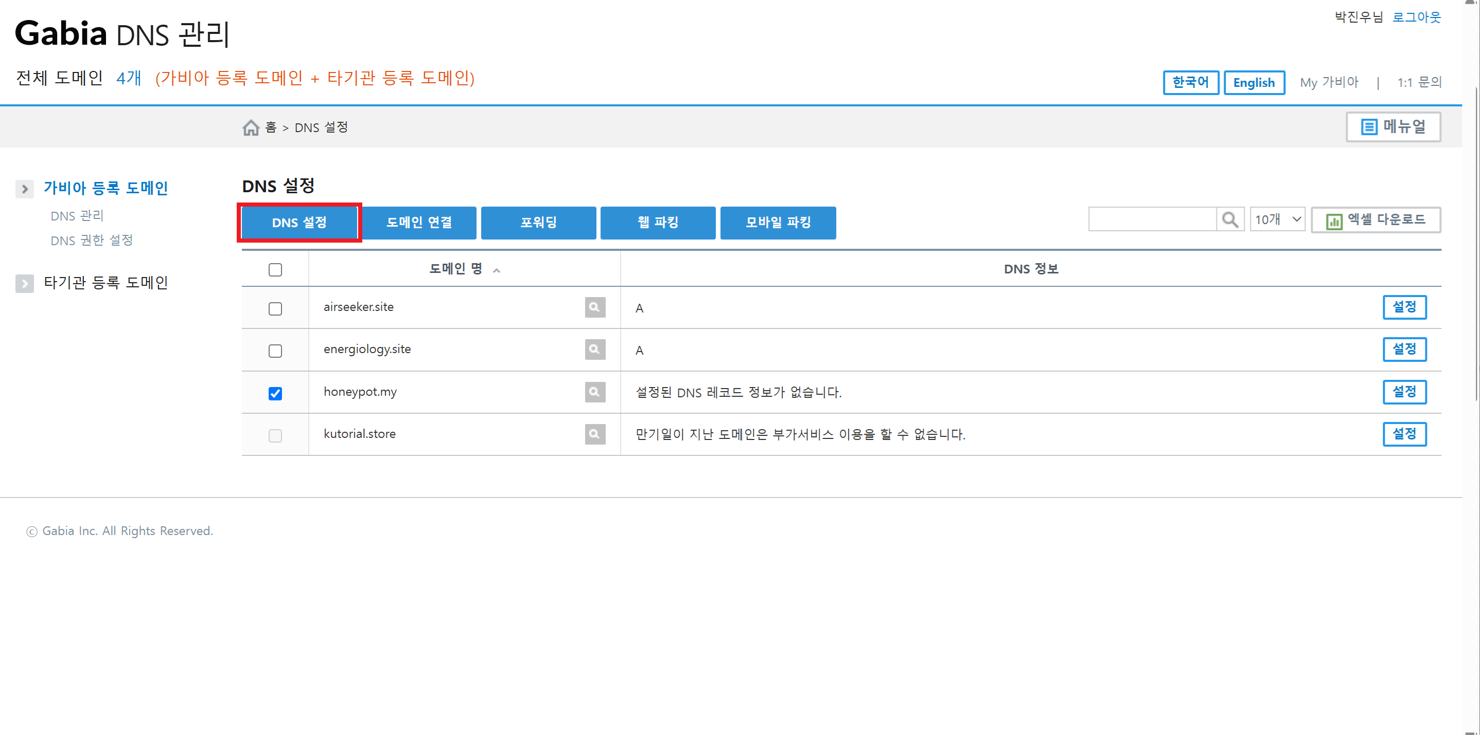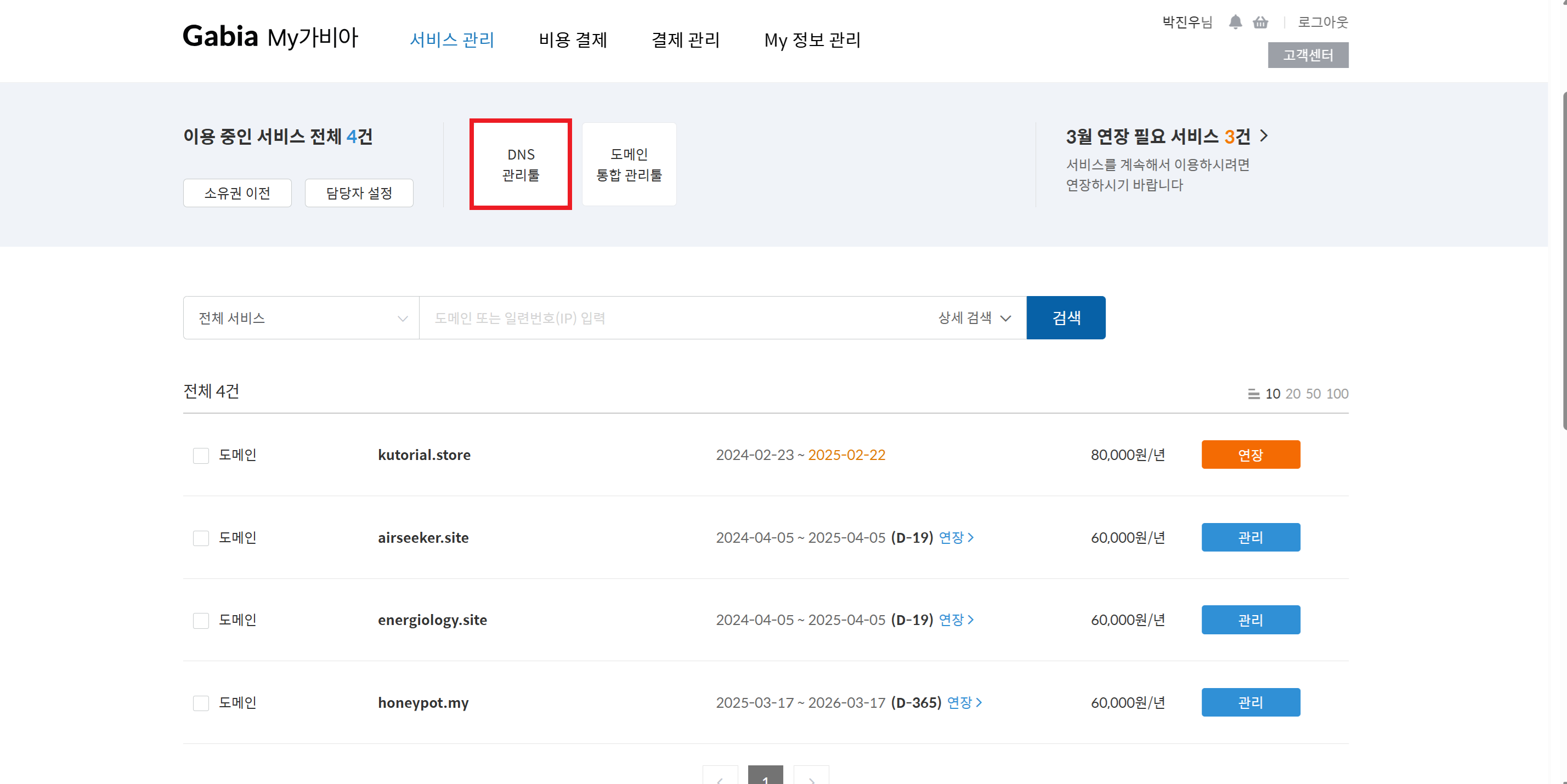 가비아 - 서비스 관리 - DNS 관리툴을 클릭한다.