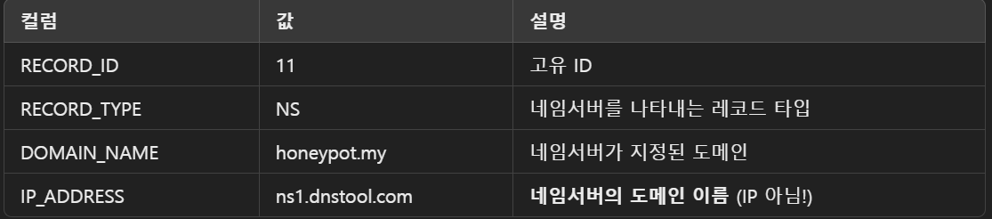 위와 같은 NS Record가 있다고 하자. 사용자가 honeypot.my로 접속하였을 때 ns.dnstool.com서버로 A, CName, MX타입 등의 DNS 질의를 보내는 것이다. CName Record와 비슷해 보이지만 다르다.