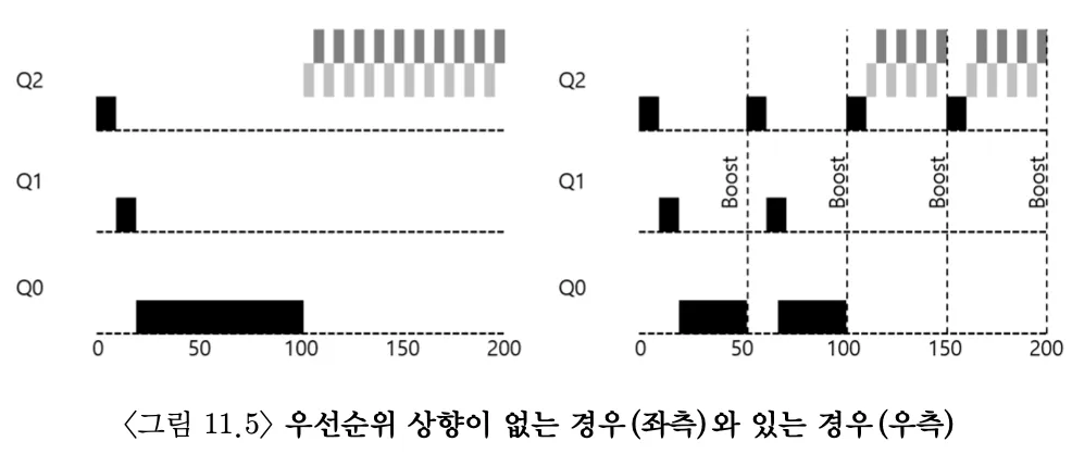 기아 문제를 방지하기 위해 CPU 위주의 작업의 진행을 조금이라도 보장할 수 있는 방법을 생각해보자. 주기적으로 모든 작업의 우선순위를 상향 조정(boost)하는 방식이 있다.