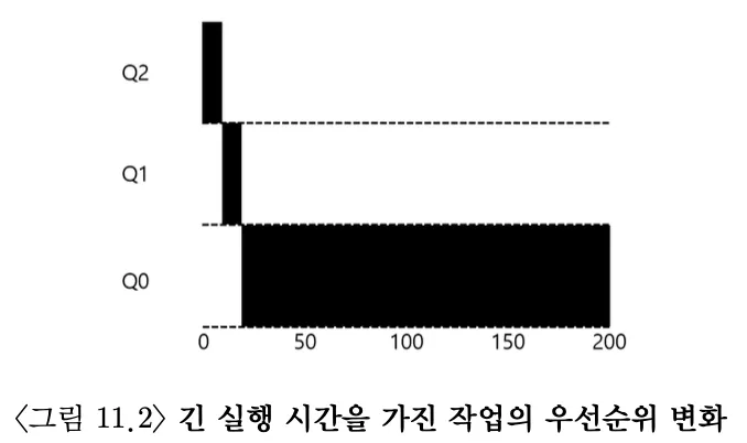 긴 실행 시간을 가진 작업이 도착했을 때, 처음에는 최고 우선 순위로 진입한다. 타임 슬라이스가 지날 때마다 우선 순위가 한 단계씩 낮아지게 된다.