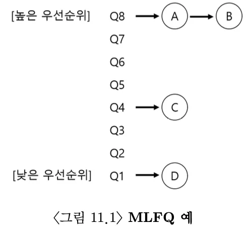 MLFQ는 여러개의 큐로 구성되며 각각 다른 우선순위(priortiy)를 가진다. 실행 준비가 된 프로세스는 여러 큐 중 하나에 존재한다. MLFQ는 우선순위가 높은 작업을 먼저 스케줄한다. 같은 우선 순위를 가질 경우 RR 방식을 이용한다.