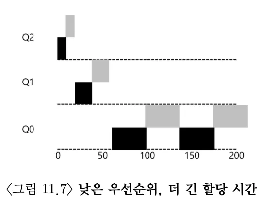규칙 4: 주어진 단계에서 시간 할당량을 소진하면(CPU를 몇 번 양도하였는지 상관없이), 우선순위는 낮아진다. (즉, 아래 단계의 큐로 이동한다.)