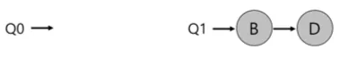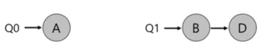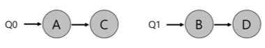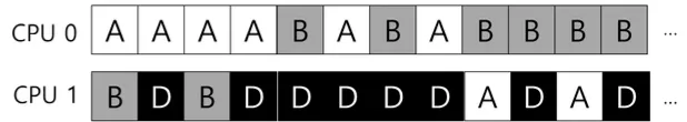 예를 들어, 현재 시스템에 CPU 0, 1과 작업 A, B, C, D가 있다고 가정하자. 각각의 스케줄링 큐가 내린 작업 배치가 다음과 같다고 해보자