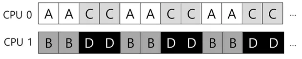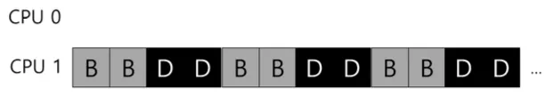 RR 스케줄링 정책을 사용할 경우 스케줄 결과는 다음과 같다. A가 B,D보다 2배의 CPU를 차지하게 되고, 이는 바람직한 스케줄링이라고 할 수 없다. 여기에 A까지 종료된다면, CPU 0은 유후상태가 될 것이다.