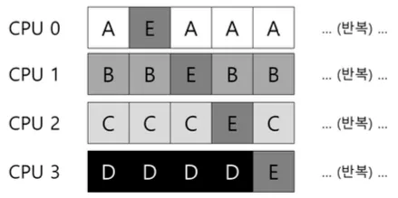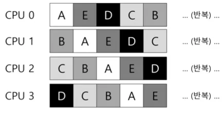 A~B 작업은 각각 자신의 CPU에서 실행되고, 오직 E만이 프로세서를 이동하며 실행된다. 이런 방식으로 대부분의 작업의 캐시 친화성을 보존하고 있다. 다음에는 다른 작업을 이동시키는 방식을 통해 친화성에 대한 형편성도 추구할 수 있겠지만 그 경우 구현이 복잡해질 수 있다.