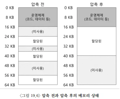 간단한 해결 방법은 압축이다. 세그먼트를 한쪽 방향으로 몰아넣어 여유 공간을 만든다. 세그먼트들은 연속된 공간에 넣기 위해 복사가 일어나는데, 메모리에 부하가 크고 많은 프로세서 시간을 사용하기 때문에 압축의 비용이 많이 든다.