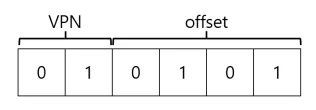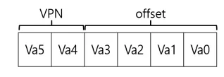 먼저 가상 주소를 가상 페이지 번호(virtual page number, VPN)와 페이지 내의 오프셋 2개의 구성 요소를 분할 한다. 위 예의 경우 주소 공간의 크기는 64이기 때문에 6비트가 필요하다().