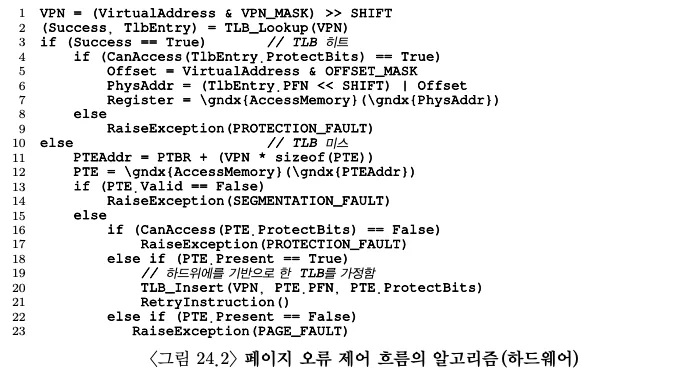 하드웨어 기반/ 소프트웨어 기반 TLB 모두 페이지 폴트에 대한 처리는 OS가 맡는다. OS의 페이지 폴드 핸들러가 그 처리 방식을 규정한다.
