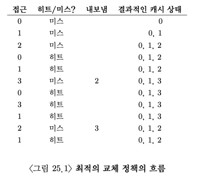 최적 미스 정책은 미스 발생 횟수를 최소화한다. 페이지를 내보내야할 때, 지금부터 가장 먼 시점에 필요하게 될 페이지를 버린다.