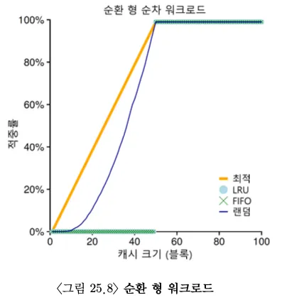 LRU와 FIFO 정책에서 좋지 못한 성능을 보인다. 오래된 페이지를 내보낸다는 특성으로 인해 캐시 크기가 49라고 할지라도 50개 페이지를 순차 반복하는 경우 히트율이 0%가 된다.