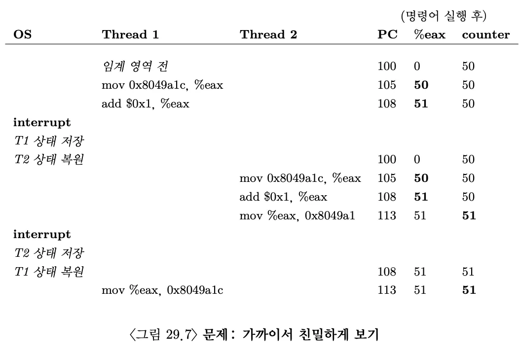 현재 counter는 50이 저장되어있다. 쓰레드 1이 그 값을 %eax에 반입하고 1을 더하는 연산을 완료한 시점(105)에 타이머 인터럽트가 발생했다. 이제 쓰레드 2에서 똑같은 연산을 시도하게 되면 50이라는 값을 읽게될 것이다. 그러면 스레드 1, 2가 모두 끝난 시점에 counter 값은 51이 될것이다.