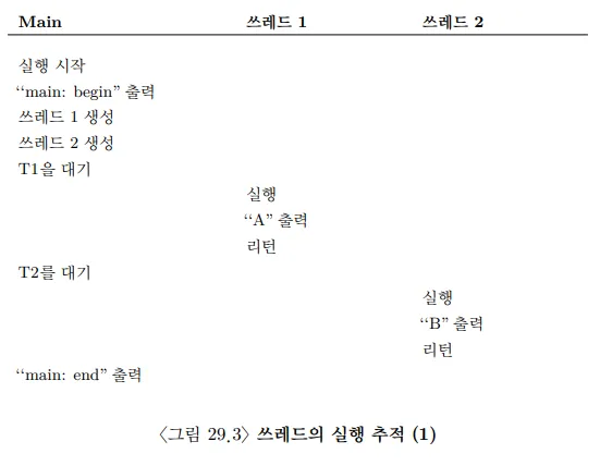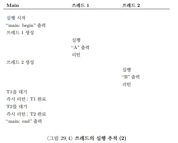 두개의 쓰레드를 생성한 후, 메인 쓰레드는 pthread_join()을 호출하여 다른 쓰레드의 동작 종료를 기다린다.