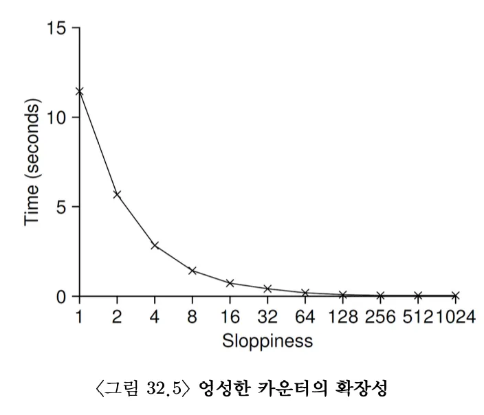 엉성한 카운터의 기본 개념은 다음과 같다. 쓰레드는 지역 카운터를 증가시킨다. 이 지역 카운터는 지역 락에 의해 보호된다. CPU들에 분산되어 있는 쓰레드들은 지역 카운터를 경쟁 이 갱신할 수 있다. 확장성이 있다고 볼 수 있다.
