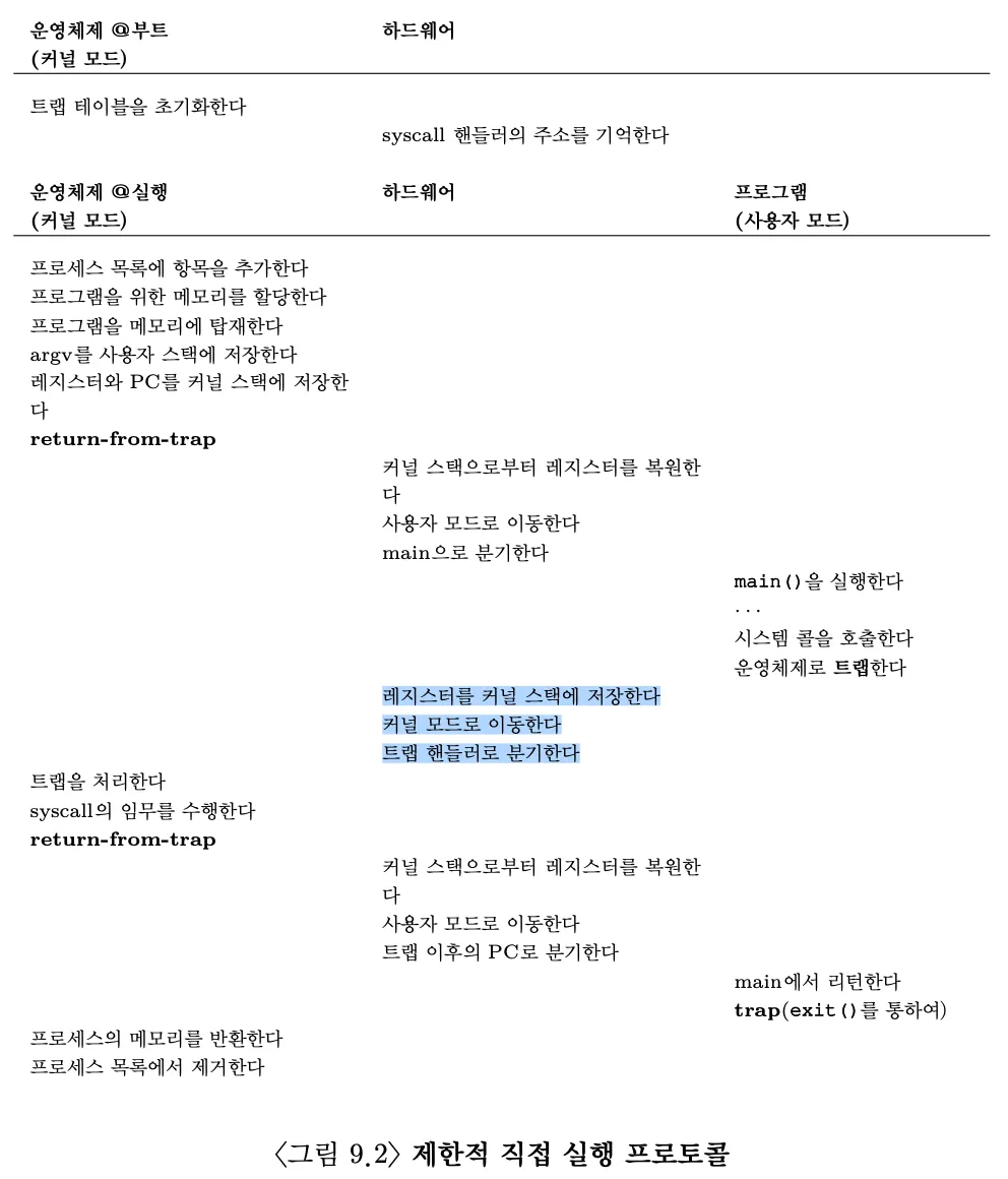 이를 위해 “제한적”으로 프로그램을 실행해야 한다. 그렇지 않다면 운영체제는 어떠한 것도 제한할 수 없으며 단순한 라이브러리일 뿐이다.