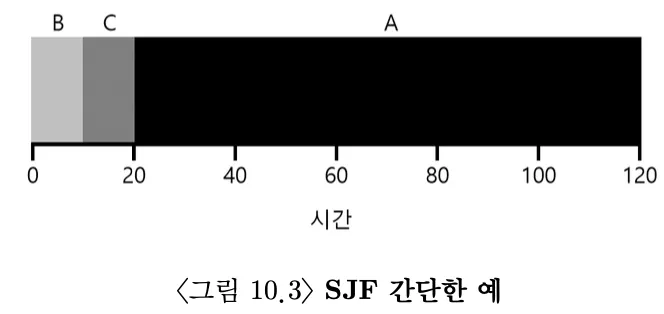 모든 작업이 동시에 도착한다면, SJF는 최적(optimal)의 스케줄링 알고리즘이다. 그러나 프로세스가 동시에 도착하는 것은 비현실적이다.