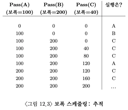 무작위성 기반의 스케줄링은 정확한 비율을 보장할 수 없는데, 작업 기간이 짧을 수록 더욱 그렇다. 이에 결정론적 공정 배분 스케줄러인 보폭 스케줄러(stride scheduling)이 고안되었다.
