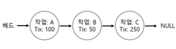 A는 0~99, B는 100~149, C는 150~399의 티켓을 할당 받는다.. winner에 난수 300이 할당되었다고 하자. 리스트를 앞에서부터 순회하면서 counter의 값을 증가시킨다. A에서는 100, B에서는 150이 된다. C에서는 400이 된다. C에서 counter 값이 난수 300보다 커지므로 C가 당첨자가 된다.