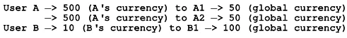 A, B가 각각 100장의 추첨권을 받았다고 가정 했을 때, A는 작업 A1, A2에게 500장씩 추첨권을 할당하고, B는 작업 B1에게 10장의 추첨권을 할당할 있다. 이때, 시스템에서는 A1, A2는 각각 50장, B1은 100장의 추첨권이라는 전역 추첨권으로 화페가치를 변환한다.