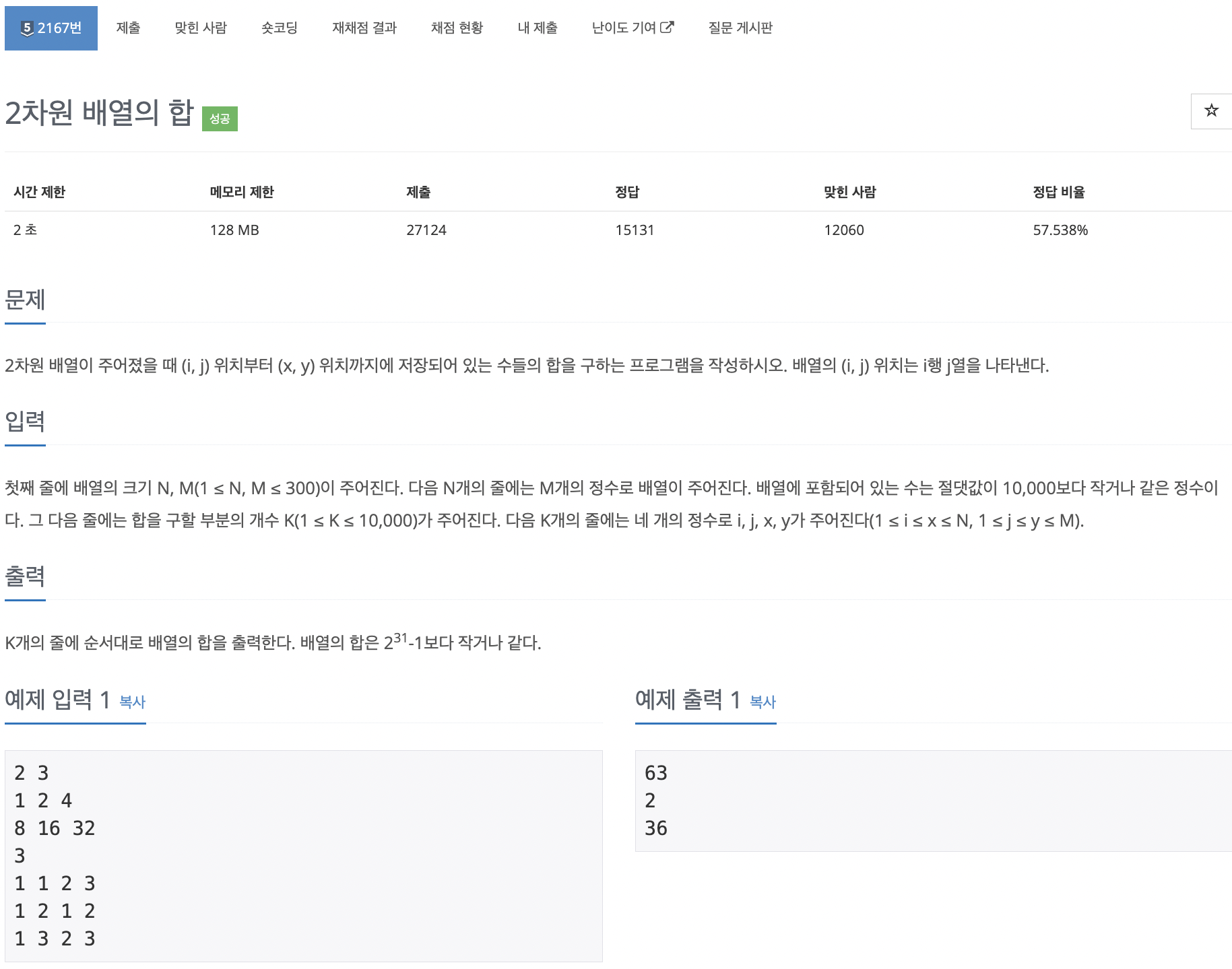 2차원 배열의 누적합을 구하고 배열의 일 부분의 누적합을 구하는 문제이다.