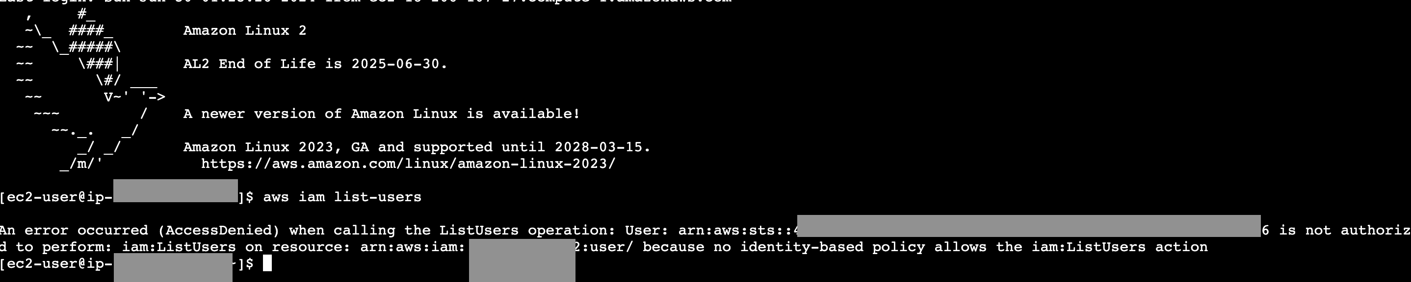 ec2 인스턴스에서 IAM사용자 목록 권한을 요청할 경우 Access Denied를 받는다. ec2에 연결된 권한정책에 사용자 목록을 요청할 권한이 없기 때문에 발생한다.