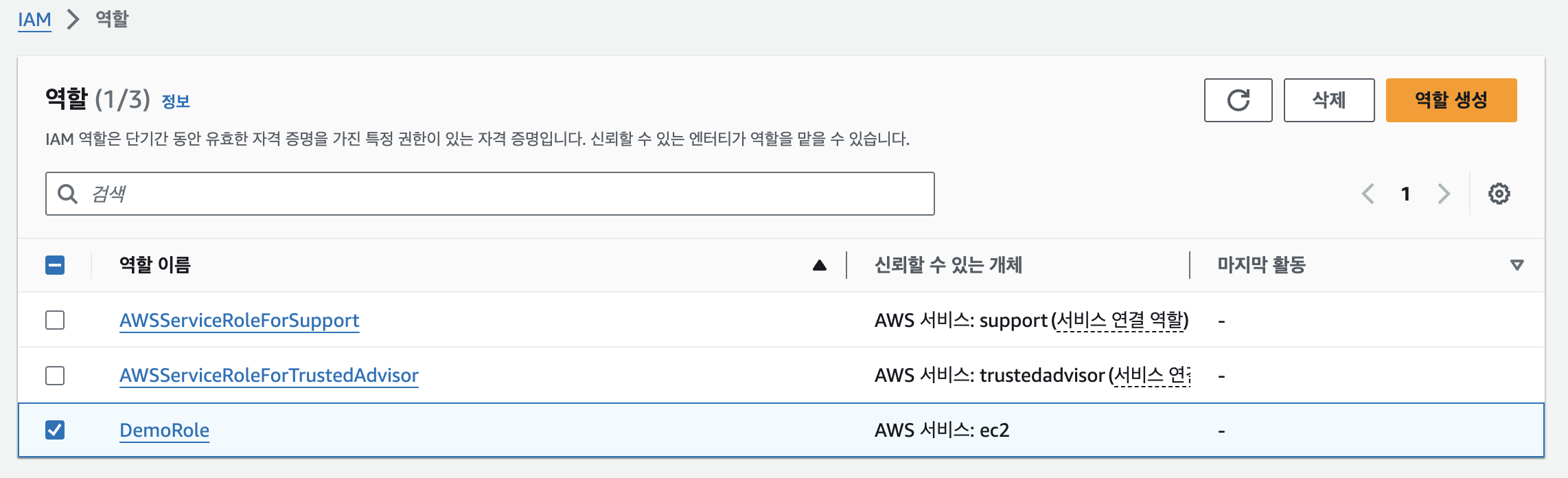 IAM > 역할(Role)에서 권한정책으로 IAMReadOnlyAccess 를 가진 DemoRole이라는 이름의 역할을 생성한다.