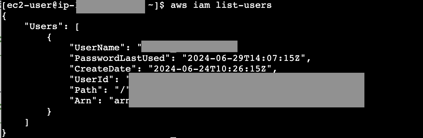 EC2역할이 부여되면 다시cli로 유저 목록을 요청했을 때 정상적으로 노출된다.