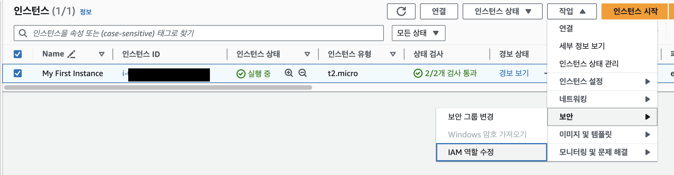 EC2 > 인스턴스 선택 > 작업 > 보안 > IAM역할 수정 에서 생성한 IAM권한정책을 추가해준다.